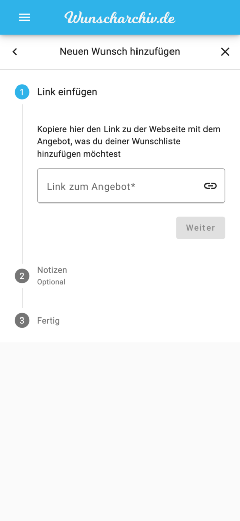 Nachdem du eine Wunschliste erstellt hast, musst du um einen Wunsch hinzuzufügen nur noch den Link zu einem Artikel deiner Wahl – eines Shops deiner Wahl kopieren und einfügen, Wunscharchiv.de kümmert sich um den Rest…